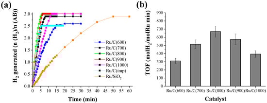 Yamashita et al. addressed the preparation of highly efficient Ru/carbon catalysts prepared by pyrolysis of a supported Ru complex (i.e., tri(2,2-bipyridyl) ruthenium (II) chloride hexahydrate) [79]. In that study, the Ru catalysts were prepared by impregnating a commercial activated carbon with the metal precursor and subsequent decomposition of the metal complex by carrying out a heat treatment at temperatures ranging from 600 to 1000 °C (catalysts denoted as Ru/C(600)-(1000)). Transmission Electron Microscopy (TEM) analysis confirmed the formation of Ru NPs even for the lowest temperatures used for the decomposition of the metal complex. The average NP size strongly depended on the decomposition temperature and ranged from 3.8 to 13.5 nm for the Ru/C catalysts. Two additional reference samples were also synthesized: Ru/C(imp) prepared by the same protocol using Ru(NO)(NO3)3 as the metal precursor, and the Ru/SiO2 catalyst prepared from Ru(bpy)32+ and commercial fumed silica, with NP size of 3.3 and 2.0 nm, respectively. The results of the catalytic activity indicated that complete conversion of AB was attained with Ru/C(800), Ru/C(900) and Ru/C(1000), whereas it was not achieved with Ru/C(600), Ru/C(700), Ru/C(imp), and Ru/SiO2. That observation led the authors to conclude that under the experimental conditions used, relatively large NPs were preferred for the reaction. Among those investigated, Ru/C(800) showed the most promising activity with an average TOF number of 670 molH2·molRu−1·min−1. That catalyst achieved 100% of conversion even after four consecutive reaction runs, but the reaction rate was progressively sluggish. A summary of the results of the catalytic activity of the materials assessed in that work is plotted in Figure 3. It was also concluded that the electronic properties of Ru NPs played an important role in controlling the catalytic performance. It was claimed that Ru/C(800) had an optimum proportion of oxidized Ru species, which are important in the reaction.