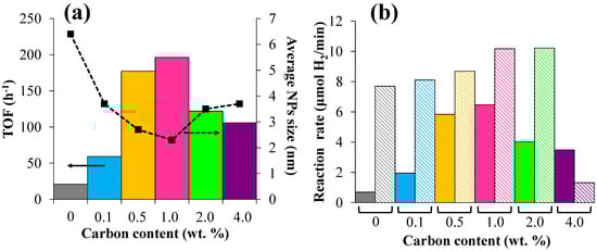 Yamashita et al. also studied the performance of g-C3N4 supported Ru catalysts [101]. In that case, carbon/g-C3N4 composites with various carbon contents (C(x)/g-C3N4; “x” is the initial carbon weight per cent of 0.1, 0.5, 1.0, 2.0, and 4.0 wt. %, respectively) were synthesized from glucose and dicyandiamide by a simple experimental procedure. The obtained supports were subsequently impregnated with RuCl3·3H2O to obtain Ru NPs after reduction with H2 gas at 300 °C. The incorporation of carbon was reported to extend the absorption of the materials to the visible region of 480–800 nm compared to the pristine g-C3N4, so the resulting Ru/C(x)/g-C3N4 were interesting photocatalysts for the dehydrogenation of AB under visible-light irradiation. Additionally, the incorporation of carbon served to achieve smaller Ru NPs than those achieved in the raw g-C3N4, which also affected the catalytic activity. Figure 4 contains information on the catalytic activity displayed by Ru/C(x)/g-C3N4. It was observed that the addition of moderated carbon contents in the catalysts enhanced the activity compared to that displayed by Ru/g-C3N4, which was related to the smaller NPs shown in those samples (Figure 4a). It was also seen that the reaction rate of all the materials improved under visible light irradiation (Figure 4b), achieving the fastest reaction rate with Ru/C(1.0)/g-C3N4.
