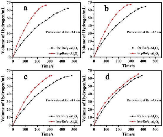 The plot of H2 volume (mL) versus time (s) graph for the dehydrogenation of AB (nAB = 1 mmol) catalyzed by the Ru with different crystal phase (fcc: face-centered cubic; hcp: hexagonal close-packed) for different particle sizes: (a) ~2.4 nm, (b) ~3.5 nm, (c) ~3.9 nm, (d) ~5.4 nm. Experimental conditions: 25 °C and nRu/nAB = 0.003. Adapted from [102].