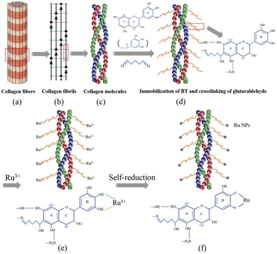 Diagram of (a) collagen fibers, (b) collagen fibrils, (c) collagen molecules, (d) immobilization of bayberry tannin (BT), and crosslinking of glutaraldehyde, (e) chelation of Ru3+ ions with phenolic hydroxyl groups, and (f) formation of Ru NPs under self-reduction. Reprinted with permission from [71].