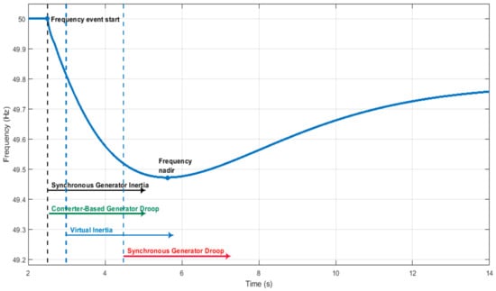 Droop control in electronic converters can be very fast, in the range of milliseconds if the primary energy source allows it. Of course, being a proportional controller, its contribution to frequency containment will not be significant during the very first moments of the event when the frequency error is very small. However, as soon as the frequency error increases, the droop controller will effectively contribute to frequency containment, in a time frame comparable to those of synchronous generator inertia and virtual inertia, helping to reduce ROCOF and to increase frequency nadir.