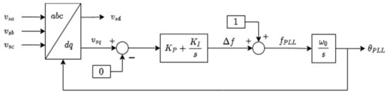 where P V I is the active power reference calculated by this loop, in p.u.; K d is the derivative constant in s, and f is the frequency deviation measured by the PLL in p.u. Figure 2 shows the scheme of the Phase Locked Loop (PLL). The main objective of the PLL is to obtain the grid voltage angle θ P L L needed for the DFIG voltage-oriented control. However, on the other hand, the increment of the frequency over the nominal frequency is obtained as well, as an intermediate variable, as shown in the figure.
