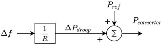 where P d r o o p is the active power reference calculated by this loop, in p.u.; R is the droop constant, in p.u.; and f is the PLL frequency deviation, in p.u. While the control scheme for primary droop control in all generations is similar, as depicted in Figure 4, from the point of view of the system response to a frequency event, the impact of droop control implemented in synchronous generation and the impact of droop control in converter-based generation will be very different due to very different response times.