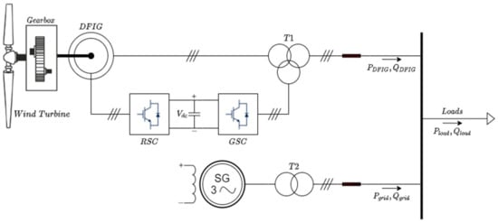 Figure 5 shows the electrical system modelled for the simulations. This system consists of a DFIG connected to a wind turbine, through a gearbox with a 1:100 ratio. The dynamic model of a DFIG has been employed in the subsequent analysis. DFIG parameters are gathered in Table 1, expressed per unit. The equations that define the dynamic model of the machine, referred to as a synchronous rotational frame (dashed variables are phasors), are as follows: