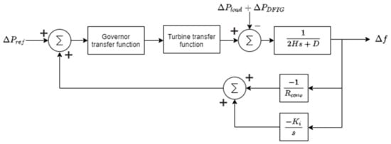 The synchronous generation model employed is depicted in Figure 6 and it represents the mechanical model of a synchronous generator [2]. Variables are named as follows: P r e f is the grid equivalent mechanical power reference variation; P l o a d is the demand active power variation; P D F I G is the DFIG-based renewable generation active power variation; H is the system time constant; D is the system damping constant; R c o n v is the droop constant; and K i is the secondary regulation constant. Secondary regulation is only enabled for the simulations and disabled for the theoretical study for a clearer analysis. Transfer functions of the governor and turbine model are based on a reheat steam turbine according to [2]. Variables are expressed in per unit and referred to conventional units’ base so that the dynamic model parameters are invariant with variations of the penetration level. System model parameters are gathered in Table 2.