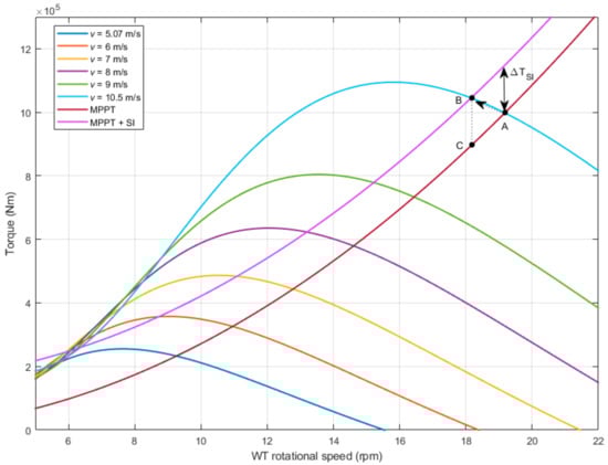 If rotational speed deviation increases and the maximum torque is surpassed, there exists a risk of reaching torque values lower than the electromagnetic torque applied by the DFIG according to the wind speed, causing a continuous deceleration and forcing the wind turbine to stop. This may happen when adding the synthetic inertia power contribution; all the aforementioned are depicted in Figure 8 with an example of stable inertia contribution that causes a deceleration from point A (previous to inertia response) to point B.