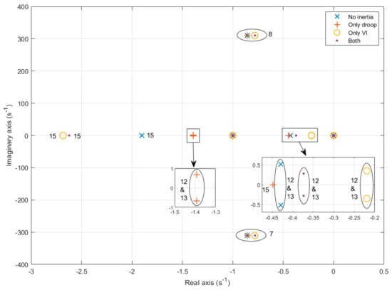 Figure 10 shows most relevant system eigenvalues for different control configurations with a 20% penetration level. Attending to eigenvalues 7, 8, 12, and 13, it can be observed that the virtual inertia loop brings them closer to the positive half plane, i.e., it makes the system more unstable. On the other hand, the droop control provides damping, making the system more stable, as it will be seen later. This is more noticeable with eigenvalues 12 and 13, where the grid frequency state variable has a high participation factor, as depicted in Table 5.
