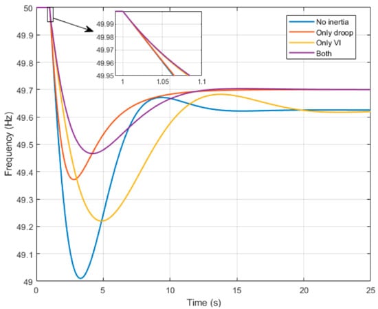 Firstly, Figure 13 shows that the ROCOF immediately after the imbalance remains the same for all the loops combinations. This is due to the fact that the initial ROCOF is only determined by the physical inertia of the synchronous generators, because the synthetic inertia control does not respond until the ROCOF is calculated and a frequency deviation is produced, respectively, in each control loop. Therefore, at the first instant the load increment is assumed only by the synchronous generator, producing the same decelerating torque and ROCOF for all the wind turbine control configurations. It is not until a few milliseconds after that the ROCOF can be calculated by the wind turbine control and the converter begins to provide that extra inertial power, affecting the system ROCOF consequently. The contribution of the droop control is extremely weak during these first instants. So, in Figure 13, the control configuration with only droop control presents the highest ROCOF (obviously, except when there is no contribution at all by the wind turbine) in the first instants. Secondly, after a few seconds, when the frequency nadir is being reached, the frequency deviation is significant and then, the droop control provides a significant contribution to the frequency control. Figure 12 shows that except for the first instants, droop control presents a better performance than virtual inertia, with a lower frequency nadir and more stable response. This figure also shows that the combination of both control loops improves the overall frequency response.