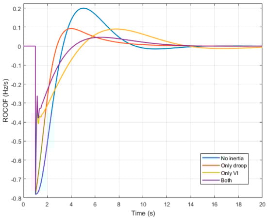 Figure 13. ROCOF response for different combinations of synthetic inertia control loops.