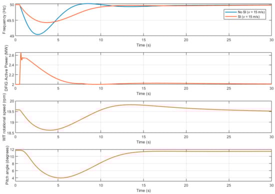 In this scenario, wind speed is constant and equal to 15 m/s. The WT is now operating at full load and the pitch control is acting to prevent that the WT exceeds its nominal power and rotational speed. As in the previous subsection, the simulation compares the frequency response of the wind turbine with and without the synthetic inertia control loops. The results are similar to the previous simulation. Figure 18 shows that the frequency nadir improves with the inclusion of the synthetic inertia control, increasing from 49.05 to 49.6 Hz, approximately, and the ROCOF is also improved. Figure 18 also shows the WT power contribution to the load increment. Although this power increment is similar to the previous case, there is a fundamental difference. While in the previous case, this power increment is supplied from the WT kinetic energy, here pitch control avoids the deceleration of the wind turbine by decreasing the pitch angle in order to maintain constant rotational speed (see pitch control scheme in Figure 8) and supplying the extra power demanded by the DFIG. This means that in this case, in opposition to the previous case, the WT would be able to supply the primary control power during a longer time as the WT mechanical stability is not concerned. Finally, as in the previous case, the WT power, rotational speed, and pitch angle are not of interest when the synthetic inertia is not enabled as the WT will act as a constant power source.