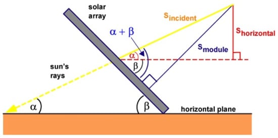 The irradiance has three components: direct, diffuse and albedo. Here, only the calculation of the direct component is detailed, and the geometrical relations seen in Figure 2 are considered. The vale of depends on the elevation angle (), which is the angular height of the sun in the sky, and the panel’s tilt angle () for which the optimal choice in Portugal is around 33° [14]. These parameters are all present in Equation (2).