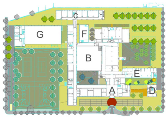 The system implementation was performed for a public educational building located in Beja, Portugal. The real meteorological conditions for the year of 2019 are obtained from Solcast [20], and considered constant for the remaining years of the simulation. The architectural plan of the building is seen in Figure 6 and the system will be implemented in rooftops G and E.