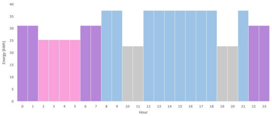 Since the information in the electricity bills is not detailed enough to know the hourly consumption of the building, all of the daily values will be an average, based on the monthly data that are known. For each month, the only information available is of the overall consumption for each one of the four cycles, which means that for every hour that is included in each cycle, the consumption value will be considered equal. In Figure 7 the daily load profile for a specific month can be seen, with the different cycles highlighted in the same colors as in Table 1.