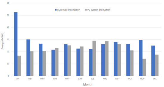 Monthly energy needs of the building (blue) and photovoltaic (PV) output energy (grey), in MWh.