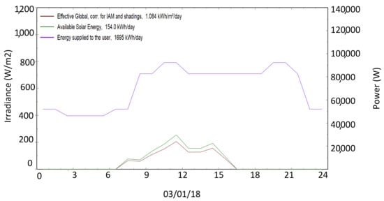 Hourly plot of the user’s needs (purple), effective global irradiance (red) and output of the PV system (green), for a day in January.