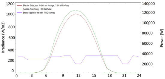 Hourly plot of the user’s needs (purple), effective global irradiance (red) and output of the PV system (green), for a day in July.