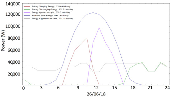 The simulation was performed for this implementation and the plots of the battery charging and discharging energy, together with the grid-injected and the available solar energy, for the day in July with the maximum energy surplus, are seen in Figure 11. Since the battery was not sized to store all of the PV energy surplus, it is seen that in this particular day a share of that surplus is stored, and when the battery reaches its maximum state of charge the charging energy goes to zero, with the remaining surplus of the following hours being injected into the grid. Once the PV energy fails to meet the user’s consumption needs, the battery starts to discharge until it reaches its maximum state of discharge.