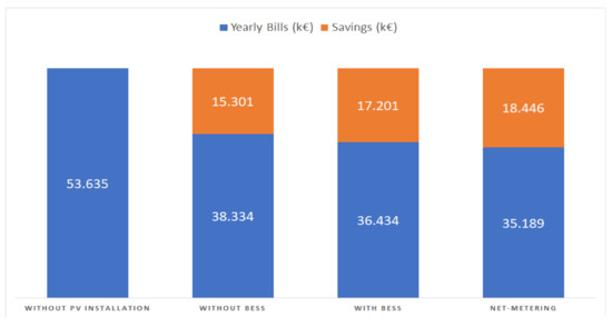 Recalling the results from Table 2, for the implementation without a BESS, the amount of energy that is self-consumed and sold to the grid is rather similar, but it is seen here that the cash flows differ significantly, with the self-consumption resulting in significantly higher savings when compared to the revenues from selling to the grid. More specifically, the average saving for each MWh that is self-consumed was 71.490 €, while the revenue per each grid-injected MWh was 43.083 €. This serves to confirm that injecting energy into the grid is being discouraged ever since FIT schemes were terminated, and energy from a PV source is sold to the grid at a much lower price than what it is bought for.
