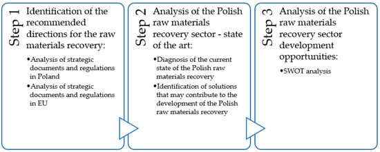 Step 2: Analysis of the Polish raw materials recovery, including the diagnosis of the current state of the Polish raw materials recovery and identification of solutions that may contribute to its development. The detailed analysis of the state of the art in this area was conducted with the use of a desk research method. It focused on an inventory and analysis of the documents (papers, reports) related to waste management and raw materials recovery. The analyzed papers included reviewed articles published in scientific national and international databases, such as BazTech, Polish Scientific Bibliography, Elsevier Scopus, Elsevier Science Direct, Multidisciplinary Digital Publishing Institute (MDPI) and Google Scholar. The analyzed reports included the reports published by the Polish entities operating in the area of the raw materials sector, the waste sector and conducting analyses of the activities of domestic enterprises, including the Polish Agency for Enterprise Development and the Statistics Poland.