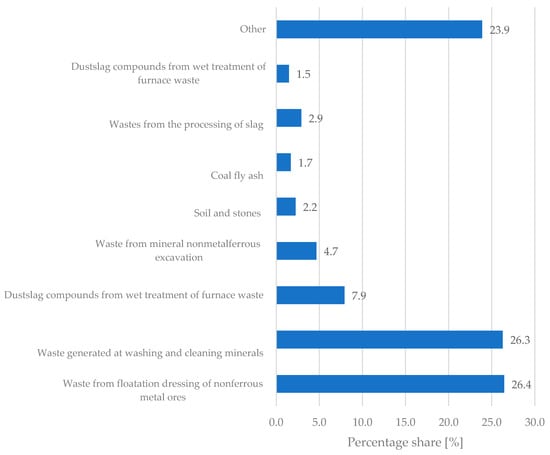 Waste management is an integral part of the raw materials recovery sector. In Poland, the statistics collected in Poland each year have detailed data on waste generated in the country [42]. Data are prepared in accordance with the Act on waste [35] and in accordance with the waste catalog [43], dividing waste into groups, subgroups and types according to the source of their generation. The catalog includes approximately 950 types of waste classified in 20 groups. In 2019, almost 127 million Mg of waste was generated, of which 10.1% was municipal waste (12.8 million Mg). The largest amount is non-municipal waste, which amounted 114.1 million Mg. The amount of waste generated annually remains at a similar level, with a constant growth of the GDP, which may indicate positive trends in waste management. The main source of waste in 2019, as in previous years, were mining and quarrying (55.8% of generated waste in total), industrial processing (23.8%) as well as electricity, gas, steam and hot water production and supply (12.3%). The structure of the industrial waste generated is shown in Figure 3. The largest share in the amount of waste generated was waste generated during the search, extraction, physical and chemical processing of ores and other minerals (60%) and waste from thermal processes (20%) [42].
