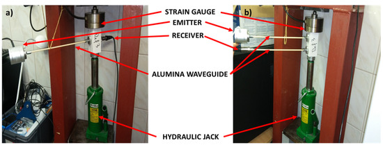 The concept of alumina waveguide connecting the measurement system and a sample under investigation is quite common in multiple high-temperature monitoring systems [29]. The fundamental role of an alumina waveguide is to transmit acoustic signal from the emitter to the sample and as well from the sample to the receiver while ensuring high dimensional stability. In the initial stage of adaptation, three system configurations were tested in order to investigate if alumina waveguide can be incorporated into the SAS without any detrimental effect on the system features. The first set of measurements was conducted in reference, standard SAS configuration, where an acoustic emitter (ET-5018 Dancer Classic) and receiver (accelerometer IMI 623C01) are directly placed on the sample. To the second intermediate configuration, one alumina waveguide was introduced, connecting the emitter and a sample, whereas in the last third configuration, both emitter and receiver were separated from the sample through a waveguide. SAS arrangement in the last two configurations is presented in Figure 6. In all three configurations, SAS monitoring was carried out on the concrete samples during cyclic compressional loading by a hydraulic jack in the range from around 90 up to 5000 kg. The main parameters of the exciters were presented in Table 1.