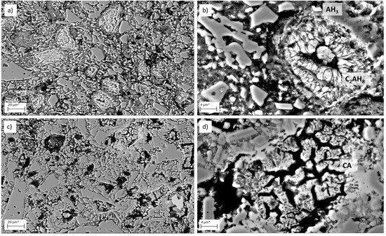 The SEM images of refractory concrete samples before and after sintering are presented in Figure 7a–d, respectively. As can be seen, in the case of material before sintering, the bonding phase is composed of the CAC’s hydration products, hydrated dicalcium aluminate 2CaO · AlO· 8HO (CAH) and Al(OH) (AH), which are uniformly distributed within the concrete’s matrix. Clearly visible changes in the microstructure are observed in the case of the material after thermal treatment, where a network of microstructural defects, pores and cracks developed as an effect of conversion, dehydration and sintering phenomena. In the case of the material after sintering, the main bonding phase constitutes the monocalcium aluminate CaO · AlO or CA. The hydrated dicalcium aluminate 2CaO · AlO 8HO (CAH) and Al(OH)(AH) are the main hydration products of CAC cements usually developing after 24 h of curing in room temperature. The chemical composition of the hydrated phase (Figure 7b was additionally analyzed with EDS, which confirmed the bonding phase being the 2CaO · AlO 8HO(CAH) and Al(OH)(AH).
