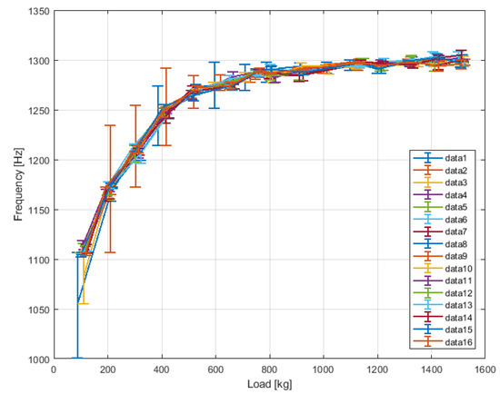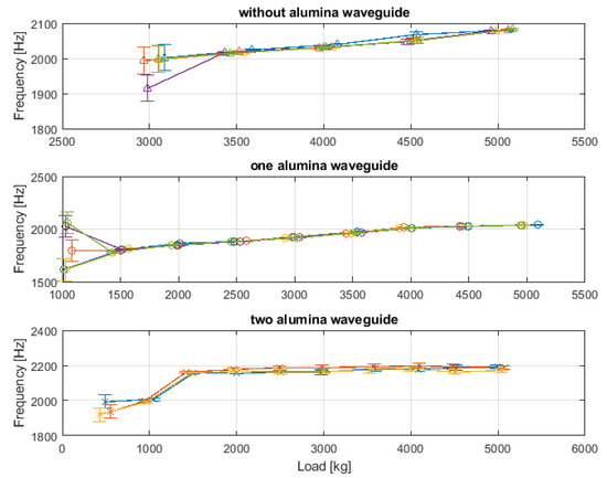 The load–resonance frequency characteristics obtained during cyclic compressional loading determined by SAS working in three configurations are presented in Figure 11. In reference, standard SAS configuration load variation induces the oscillation frequency system’s change in the range of 1380 and 2050 Hz, with the characteristic exhibiting a typical nonlinear character. In the case of the second intermediate configuration with one alumina waveguide connecting the emitter and a sample, basically no change in the determined characteristic can be observed, compared to the standard SAS configuration. Results obtained with the third configuration, where both emitter and receiver are separated from the sample through a waveguide are shifted to the higher frequency level and exhibit different character. Above 1500 kg, no significant change in resonant frequency with increasing load can be observed.