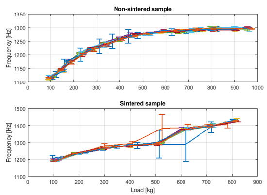 Load and resonance frequency characteristics obtained with the piezo-emitter are presented in Figure 10 for non-sintered and sintered sample. In the second configuration, SAS monitoring was only possible up to 800 kg. For higher loading levels, we observed multiple step changes of the frequency, which made it impossible to conduct any comparative study above this load level. In order to compare the frequency variation determined with the use of acoustic and piezo-emitter, the relative change of frequency was calculated for the two loading ranges: 100–1500 kg and 100–800 kg. Summarized results are presented in Table 3.