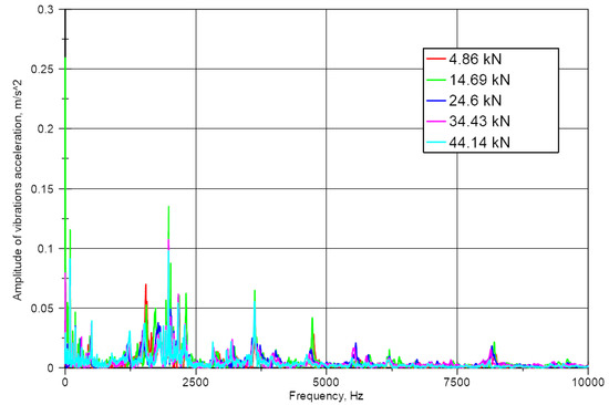 Exemplary results for one emitter in the frequency domain are shown in Figure 12. Within it, a few resonance peaks are visible, including some at constant distances. The results from additional tests of self-excitation for different emitters are shown in Figure 13. As can be seen, each emitter produces a similar response; however, their values differ. The load and resonance frequency characteristics for the second and third emitters are moderately similar, but a shift in values can be observed.