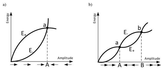 An important issue related to self-excitation systems is the phenomenon of the boundary cycle. The boundary cycle occurs when the system will vibrate in a steady state. The energy balance will be zero when the system draws as much energy as it will lose. The vibrations will remain unchanged. The situation in which there is an excess or under-supply of energy is shown in Figure 14. Figure 14a shows that, the more energy supplied (), the amplitude increases to the value A until the balance is zero. For , the amplitude will decrease to the same A value. There are also more complex situations. Figure 14b shows that there may be more equilibrium points: here, for example, three. First, at the beginning of the coordinate system and the second and third for amplitudes A and B. The amplitude increases or decreases depending on which part of the graph the system is located in. The second graph presents the difference between a steady and a non-steady cycle. The cycle for amplitude A can be called stable because the amplitude around point A is heading towards it. The amplitude B is of the unstable cycle. This area behaves in exactly the opposite way as around the A point—amplitudes greater than B increase even further, and smaller ones decrease, in this case to A [38].