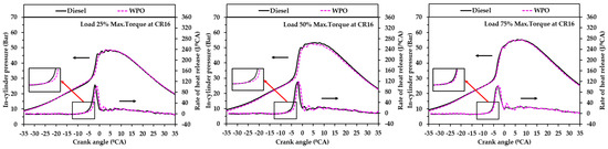 The variation in the rate of heat release (RoHR) and in-cylinder pressure (ICP) with the crank angle for WPO and diesel fuel at different engine loads is presented in Figure 6. ICP measurements play a key role in combustion analysis of the thermal energy produced during the fuel combustion process in each engine cycle. The RoHR was calculated using the in-cylinder pressure, which is measured according to the first law of thermodynamics and isentropic relations [39]. ICP and RoHR were found to increase as the engine load increased in all tests due to the higher charge of the mixture that was carried to the cylinder [40]. Compared with diesel fuel, a lower in-cylinder pressure was obtained with WPO at medium and high engine loads for CR18. In addition, the start of the combustion of WPO, compared to that of the diesel fuel, was more delayed. This may be due to the lower density of WPO, which can result in a lower bulk modulus. In addition, the lower cetane index of WPO could explain the delay time in combustion with WPO [18,41]. A higher engine load leads to a shorter ignition delay period and longer combustion periods. This is due to the increase in temperature inside the combustion chamber, which tends to improve the quality of the air–fuel mixture, leading to a decrease in the ignition delay [42].