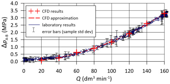 The figures show the results obtained during laboratory experiments as well as simulations and approximations of curves. Additionally, error bars in the form of a standard deviation of the samples were added. The error bars are shown for every fifth sample on a scale of 2 for better visibility. It arises from the figures that a high level of compliance was achieved. The results obtained from CFD analysis do not differ from laboratory experiments by more than % for low flow rates, up to 40 dm min and by % for the rest of the considered range.