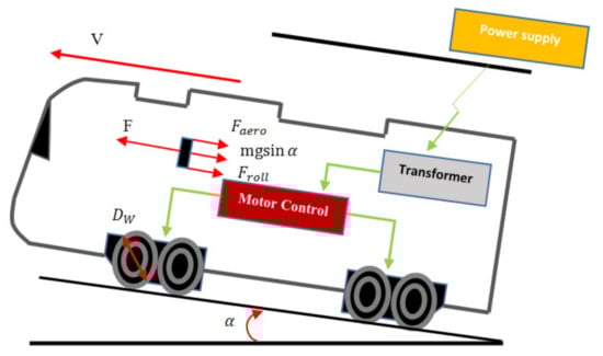 The initial design corresponding to the train specifications was carried out based on the train motion equations. Based on the train motion equations and the provided train specifications, the rated speed was determined. Subsequently, the rated torque of the traction motor was calculated. A simple electric traction system is illustrated in Figure 1.