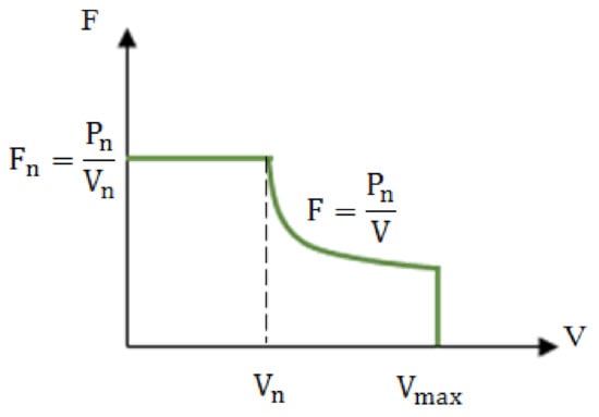 where Vn and Pn refer to the rated train speed and the rated propulsive power per traction motor, respectively.