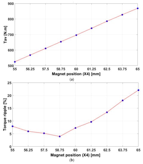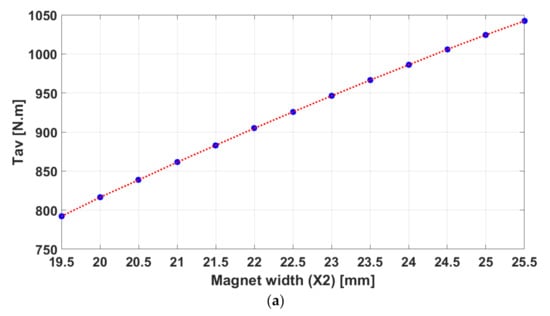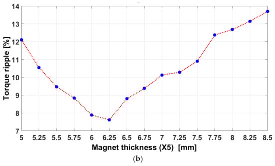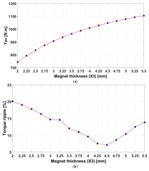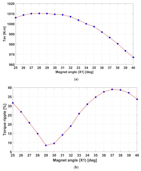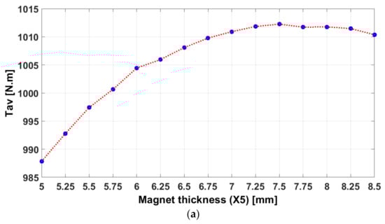 Since the purpose of optimal design is to maximize the average torque and to minimize the torque ripple, determining the appropriate variation interval for all of parameters is required. For example, in case of a side magnet angle, it can be observed that the points corresponding to the maximum average torque and minimum torque ripple approximately coincide with each other. Hence, it is obvious that the optimal value for the side magnet angle is located in the immediate vicinity of the points corresponding to the maximum average torque and minimum torque ripple. According to Figure 8a,b, it can be seen that as the central magnet thickness is stepped up, the average torque is stepped up, and consequently, it saturates. The torque ripple also consists of a minimum value as the side magnet thickness increases. In this case, since the points corresponding to the average torque knee value and the minimum of the torque ripple coincide with each other, the proper variation interval for the central magnet thickness for the optimization process would be determined around the knee point of the average torque. In case of other parameters, regarding the increment rate or decrement rate of the average torque and torque ripple, the appropriate corresponding parameter variation for the optimization algorithm could be determined.