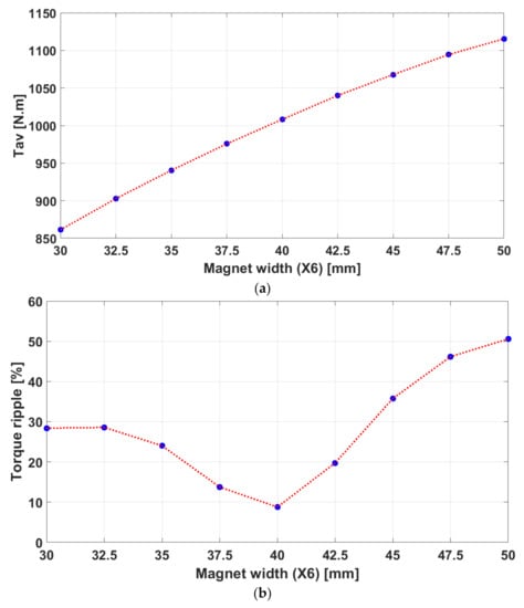 Impact of the central magnet width variation on: (a) the average torque; (b) the torque ripple.