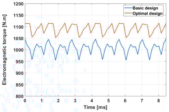 Electromagnetic torque corresponding to the basic design and the optimal design.