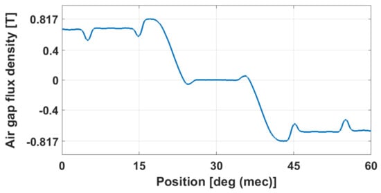 The initial states for the optimization algorithm are the values assigned to the basic design, which are obtained by sensitivity analysis and are tabulated in Table 4. Moreover, the outcomes of optimization are demonstrated in Figure 10. As can be seen, the torque ripple is reduced by 64% and the torque average is increased from 1008 Nm to 1093 Nm. Figure 10 illustrates the electromagnetic torque of the optimal and basic design. No-load air gap flux density distribution for one pole pith (60 deg mechanical) and no-load flux linkage for the optimized structure are illustrated in Figure 11 and Figure 12, respectively. The represented air gap flux density distribution corresponds to the structure illustrated in Figure 3.