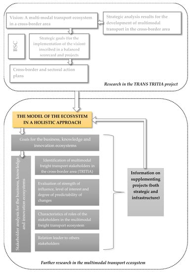 The objective of the research was the stakeholders’ analysis and identification of their roles in the ecosystem of multimodal freight transport within the Polish–Czech–Slovak cross-border area. The conceptualization of the multimodal freight transport ecosystem was essential to achieving the objective. Thus, this paper begins with the analysis of contemporary approaches in the field of ecosystems, especially knowledge, business, and innovation ecosystems. In these ecosystems, particular attention has been focused on stakeholders and their roles. The assumptions of ecosystems were also searched for in the literature in the area of multimodal transport. The research methodology is then discussed, indicating the impact of the results of the TRANS TRITIA project on the research proposed in this paper.