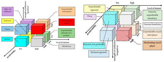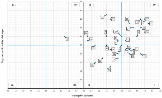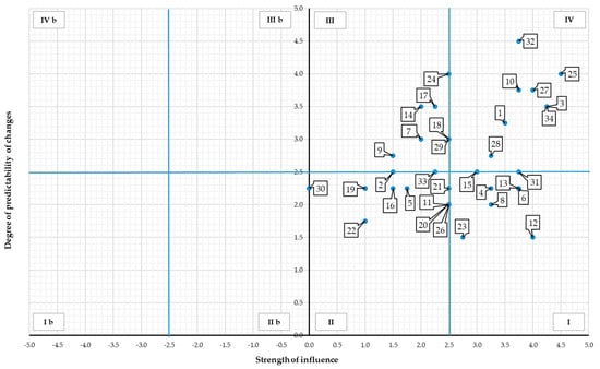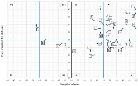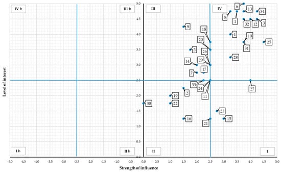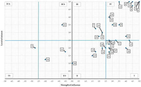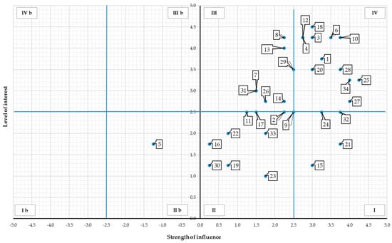 Due to the fact that the strength of influence may have both positive and negative character, the aforementioned numbers of individual parts of the map apply to the positive influence. Similarly, as indicated above, the quarters of the map were marked for the negative impact of stakeholders, only the symbol “b” was added to the numbers of the quarters (quarter Ib, IIb, IIIb, IVb). The numbers assigned to the stakeholders (Table 4) were used for their presentation in the figures (Figure 3, Figure 4, Figure 5, Figure 6, Figure 7 and Figure 8).