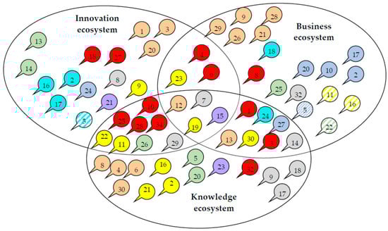 An ecosystem evolves together with the changing environment through the dynamic optimization of complementing opportunities, resources, and actors []. There are many types of them depending on the active actors, relations between them, types of flow, and especially objectives the ecosystems serve for. As a result, the ecosystems of innovation, start-ups and entrepreneurship appeared next to the business ecosystem. According to the research [,], most papers (acc. to database, WoS and SCOPUS) are registered about innovation, business and entrepreneurship ecosystems. Another type of ecosystem that is often distinguished is the knowledge ecosystem, next to the corporate ecosystem, the SME ecosystem, the cluster ecosystem or the start-up ecosystem. Objectives have special meaning in specifying the type of ecosystem and their boundaries may be determined based on the relationships of cooperation and competition of the engaged entities, geographical outreach (local vs. regional or national vs. global), time scale (from history to future or statistical clips) or types of flow (knowledge, value, material) [,,]. Clarysse et al. [] differentiate the knowledge and innovation ecosystem using a few criteria, i.e., objectives, relationships and actors. Pilinkiene and Maciulis [] use the type of environment, actors, micro and macro results, and key success factors to differentiate industrial, innovation, business, digital and entrepreneurial ecosystems. Valkokari [], based on similar criteria, identifies three different types of ecosystems: business, innovation, and knowledge. Scaringella and Radziwon [] as well as Aarikka-Stenroos and Ritala [] differentiate business, innovation and entrepreneurial ecosystems and focus on geographical aspects and economic problems. The approach proposed by Valkokari who has differentiated three ecosystem types: business, innovation, and knowledge, was used in the paper.