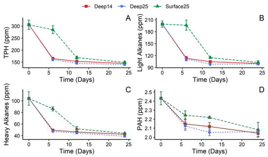 Hydrocarbon biodegradation over time for the Deep14, Deep25 and Surface25 treatments for (A) total petroleum hydrocarbons (TPH), (B) light alkanes (C14-C25), (C) heavy alkanes (C26-C35) and (D) PAHs. Values on the y-axis correspond to the concentration range of each hydrocarbon group to aid visualisation. Error bars represent the standard deviation (n = 3).