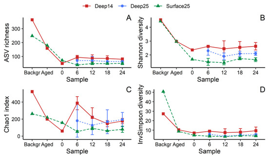 A steep drop in alpha diversity was observed with seawater storage, i.e., between the background (fresh) and aged seawater (Figure 3, Figure A1). Alpha diversity decreased further with oil contamination (starting consortium Day 0) but did not change further with time during the incubation experiment. Statistical analysis to test for differences between treatments and time effects on alpha diversity metrics was performed for Days 6, 12, 18 and 24, in which triplicate samples were collected. Alpha diversity, as measured by the Shannon index, differed significantly between treatments (F = 42.09, d.f.2, p < 0.001) but did not change with time (F = 1.41, d.f.3, p = 0.257). The same pattern was observed using other diversity metrics (ASV richness, Simpson index and Chao1 index). Pairwise comparisons with Tukey’s post-hoc test showed consistently higher ASV richness and diversity in the Deep14 treatment (Figure 3, Table S2), with the exception of the Chao1 index; the diversity estimator Chao1 index, which calculates the expected ASVs based on the low abundance species (singletons and doubletons), was not significantly different between the Deep14 and Deep25 treatments (t-value = −1.81, p = 0.181).