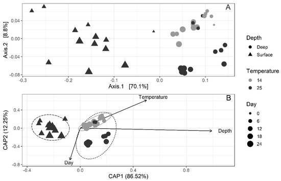 (A) Principal coordinate analysis (PCoA) of the weighted UniFrac distances. (B) Distance-based redundancy analysis (dbRDA) of the weighted UniFrac distances quantifying the impacts of depth, temperature and time on microbial community composition. Cumulative sum scaling (CSS) normalization was applied to the data prior to ordination analysis to account for differences in library size.