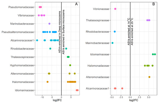 Differential abundance analysis was conducted to identify ASVs that were strongly influenced by depth, temperature and time. DESeq2 analysis by depth identified 20 influential ASVs that were strongly enriched in the Surface25 treatment (Figure 5A, Table S3). Characteristic taxa of the Surface25 treatment belong to the Gammaproteobacteria families Halomonadaceae (genus Halomonas) and Idiomarinaceae (genus Idiomarina), and the Alphaproteobacteria Thalassospiraceae (genus Thalassospira). Halomonas and Thalassospira became enriched within the first 6 days while Idiomarina became influential after Day 12 (Table S4). DESeq2 analysis by temperature revealed influential ASVs in the Deep14 treatment (negative log2FC) (Figure 5B, Table S3), namely, Rhodobacteraceae (Sulfitobacter), Alcanivoracaceae (Alcanivorax), Vibrionaceae (Vibrio) and Marinobacteaceae (Marinobacter). DESeq2 analysis per treatment at each time interval (Table S4) identified common aspects in the behavior of Alcanivorax and Sulfitobacter to temperature, which both became depleted in Surface25 at 0–6 days and in Deep25 between 6 and 18 days. On the other hand, Thalassospira was favored by higher temperature, as evidenced by enriched ASVs in the Deep25 treatment between 12 and 24 days (Table S4).