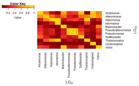 Levin’s Overlap (LO) takes into account the species abundance across environments and indicates which taxa coexist on a heatmap plot (Figure 6). LO12 and LO21 axis values do not necessarily have the same indices as that depends on the distribution of the compared taxa and their classification as specialists or generalists [38]. For example, a strong overlap between Alcanivorax and Sulfitobacter was observed on the LO12 axis but not on LO21 (Figure 6). This indicates that Sulfitobacter co-occurred with Alcanivorax but the absence of Sulfitobacter did not entail absence of Alcanivorax. In addition, Idiomarina depended on the presence of Halomonas but not the opposite (LO12 overlap only). On the other hand, Halomonas and Thalassospira, as well as Pseudomonas and Pseudoalteromonas, overlap on both LO12 and LO21 axes, meaning that both species coexist in specific environments. Finally, Marinobacter depended on the presence of Vibrio (LO12 overlap only) (Figure 6).