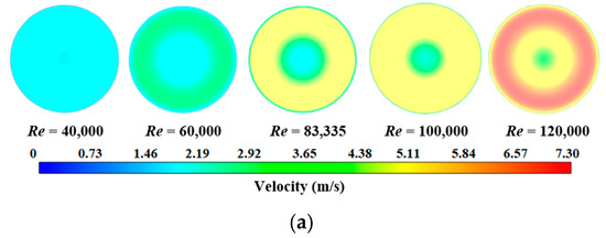 For the analyzed tube geometry, the average Nu on the inside wall (0 m < Z < 1 m) is 31.8, 32.34, 33.41, 34.06, and 34.43 for Re values of (40,000, 60,000, 83,335, 100,000, 120,000), respectively, as shown in Figure 13c. The increase in the average Nu reaches 8.27% when the Re increases from 40,000 to 120,000. The pressure drop Δp increases with the Re number, as shown in Figure 13d. As the Re increases from 40,000 to 120,000, Δp increases from 26.66 to 216.68 kPa.