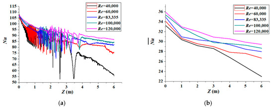The variation in the local Nu on Line 2 along the tube length for the analyzed range of Re numbers is given in Figure 13a. The results show that the Nu increases for rising Re values. As the flow progresses downstream, oscillations in the local Nu number occur due to weakening of the spiraling flow caused by viscous friction. As discussed previously, higher Re numbers result in smaller oscillations due to a stronger and more stable spiraling flow. For lower Re numbers, the spiraling flow is weaker and dissipates sooner due to the action of viscosity, resulting in large oscillations in local Nu numbers. For Re = 40,000, the onset of oscillations is located at Z = 0.4 m. This suggests that the enhancement in the heat transfer achieved by the guiding vanes is a strong function of the Re number and occurs over an effective distance, whose length also depends on the Re number. Additionally, the peripherally averaged Nu numbers along the tube length for the analyzed range of Re numbers are given in Figure 13b. The results show that the peripherally averaged Nu increases with the increase in the Re number, the average difference reaching 13.82% when the Re increases from 40,000 to 120,000.