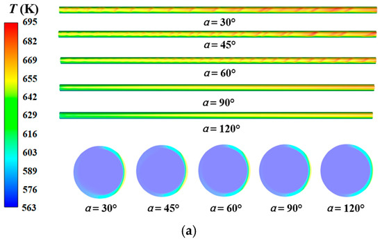 Figure 14a shows the temperature contours on the surface S1 and the cross-section S2 (Z = 0.25 m) with the spin angle α varying from 30° to 120°. The results show that, as α increases, the temperature on S1 decreases and its distribution becomes more uniform. For small values of the spin angle α, the temperature fluctuations on the tube surface along Line 1 are large, as shown in Figure 14b. As the spin angle increases, the local temperature fluctuations along Line 1 decrease in magnitude and disappear for the largest analyzed spin angle of 120 degrees. As the results show, the temperature distribution of the tube wall on S2 is also more uniform for larger α values. For an α of (30°, 45°, 60°, 90°, 120°), the maximum tube temperature shown in Figure 13b is 665.25 K, 662.29 K, 659.14 K, 655.52 K, and 644.81 K, respectively, while the corresponding temperature difference shown in Figure 13c is 94.94 K, 90.06 K, 87.56 K, 85.81 K, and 76.73 K. Both quantities decrease as the spin angle α increases. The maximum temperature of the molten salt on S2 is 619.41 K, 615.58 K, 613.37 K, 608.88 K, and 598.12 K for an α increasing from 30° to 120°. The maximum relative temperature variation reaches 4%, which means that the temperature of the molten salt flow becomes more uniform for larger α values, allowing the toleration of higher heat fluxes on the tube surface. This is because, for higher values of the α, the direction of the flow velocity is closer to the tangential flow direction, which results in a stronger spiraling flow, enhanced mixing, and a higher heat transfer enhancement.