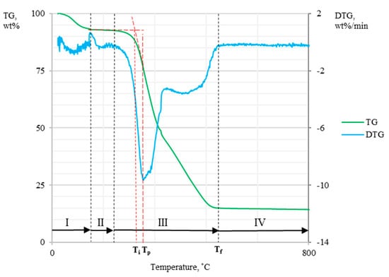 Schematic of TG and DTG curves (Ti—ignition temperature, Tp—maximum peak temperature, Tf—burnout temperature, I—evaporation, II—oxidation mass gain, III—thermal decomposition and burning, IV—burnout).